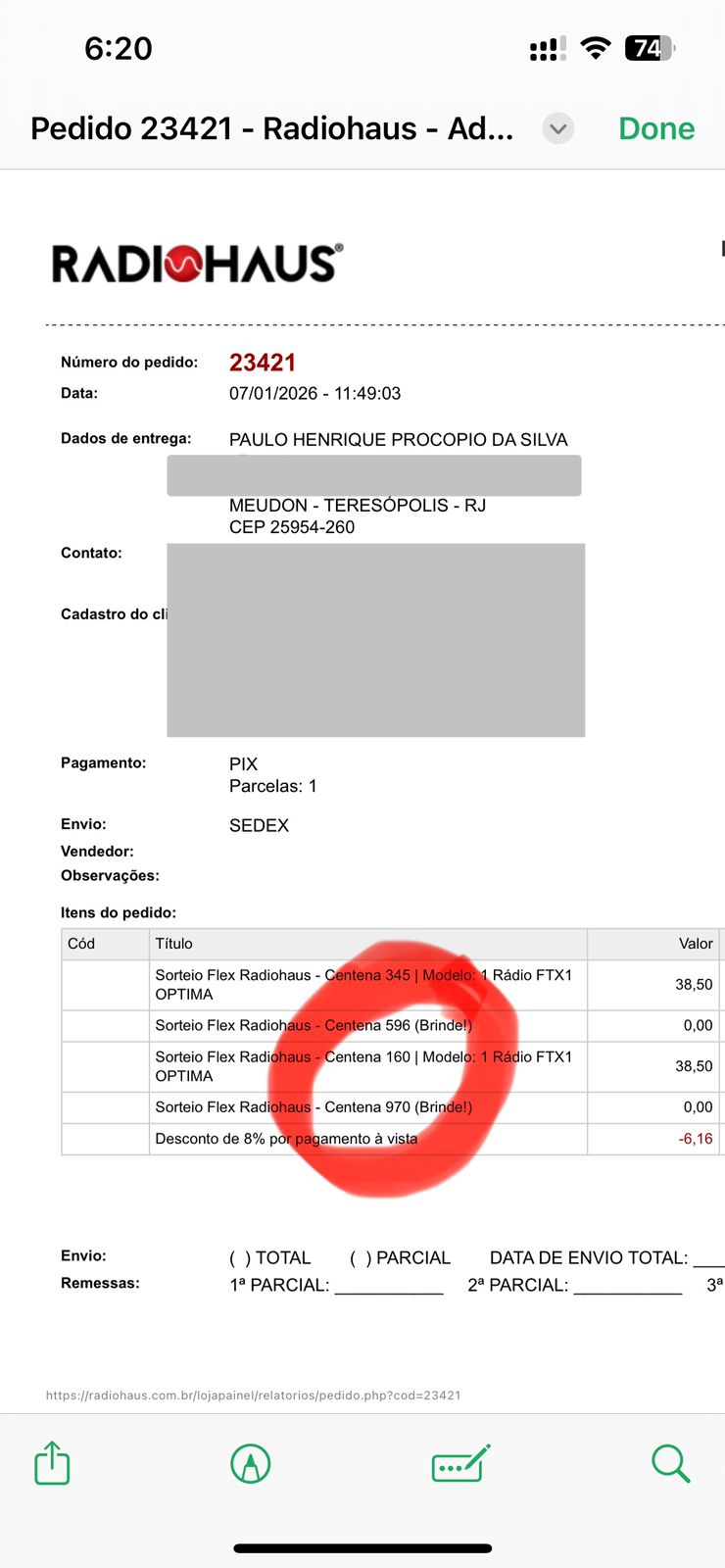 Pedido feito pelo ganhador