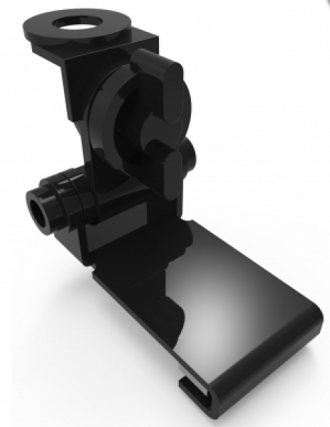 Suporte ajustável bi-articulado em Zamack e aço têm construção robusta e acabamento em pintura epóxi.